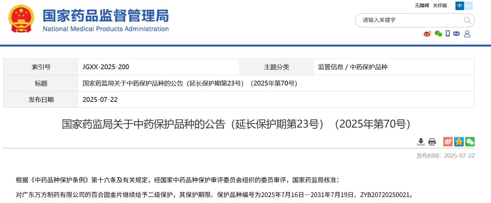 國家藥監局關于中藥保護品種的公告(延長保護期第23號)(2025年第70號)