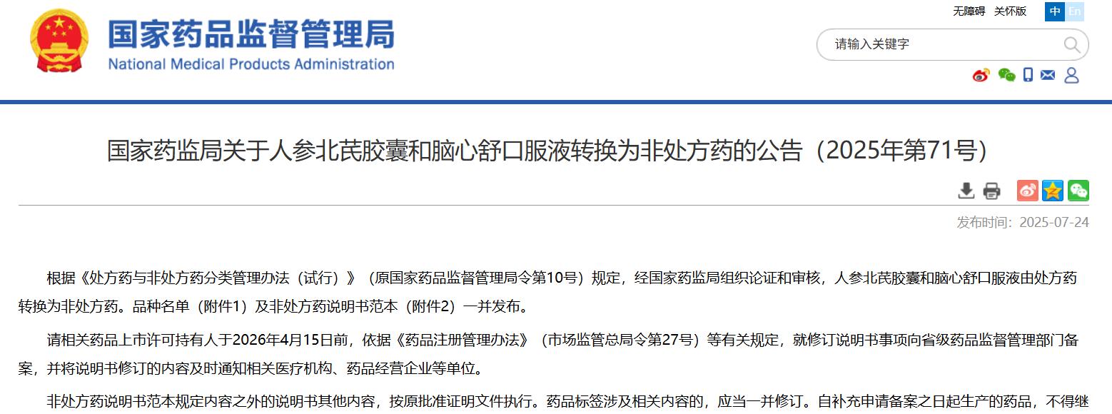 國家藥監局關于人參北芪膠囊和腦心舒口服液轉換為非處方藥的公告(2025年第71號)