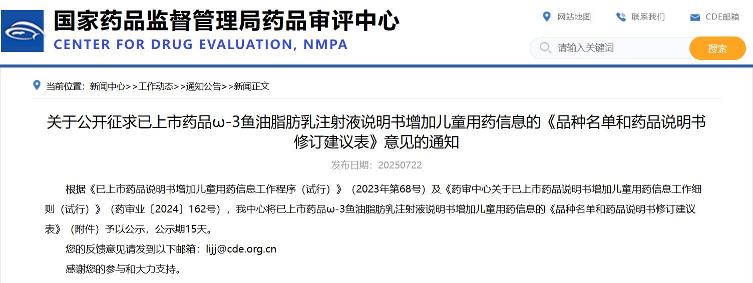 關于公開征求已上市藥品ω-3魚油脂肪乳注射液說明書增加兒童用藥信息的《品種名單和藥品說明書修訂建議表》意見的通知