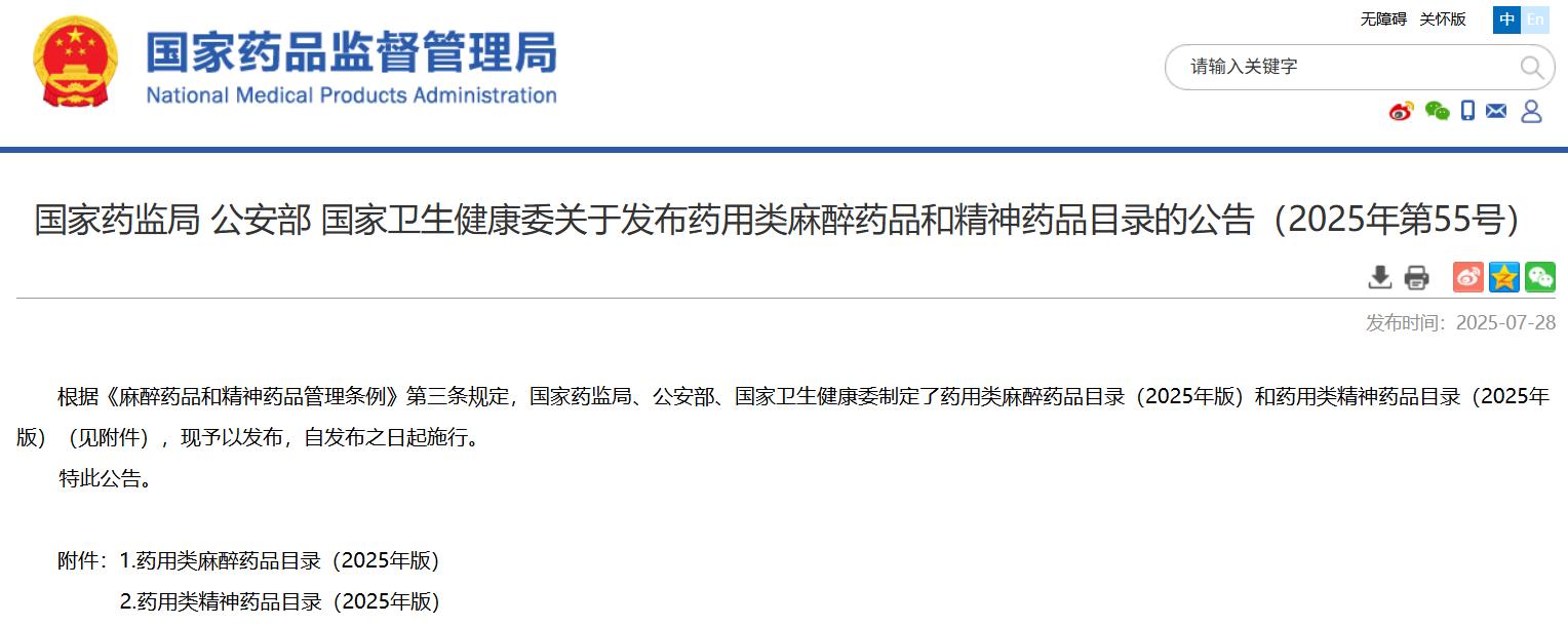 國家藥監(jiān)局 公安部 國家衛(wèi)生健康委關(guān)于發(fā)布藥用類麻醉藥品和精神藥品目錄的公告(2025年第55號)
