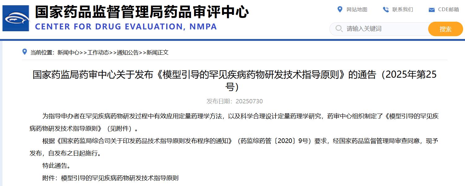 國家藥監(jiān)局藥審中心關(guān)于發(fā)布《模型引導(dǎo)的罕見疾病藥物研發(fā)技術(shù)指導(dǎo)原則》的通告(2025年第25號)