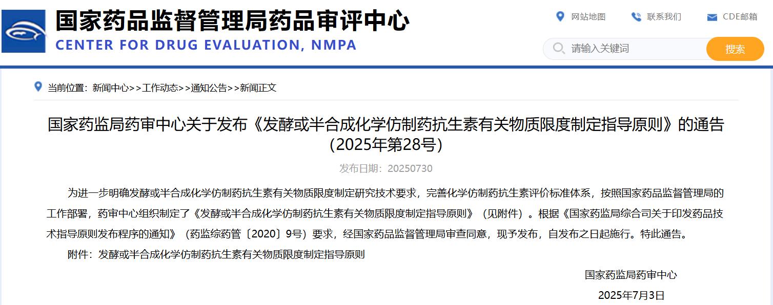 國家藥監(jiān)局藥審中心關(guān)于發(fā)布《發(fā)酵或半合成化學(xué)仿制藥抗生素有關(guān)物質(zhì)限度制定指導(dǎo)原則》的通告(2025年第28號)