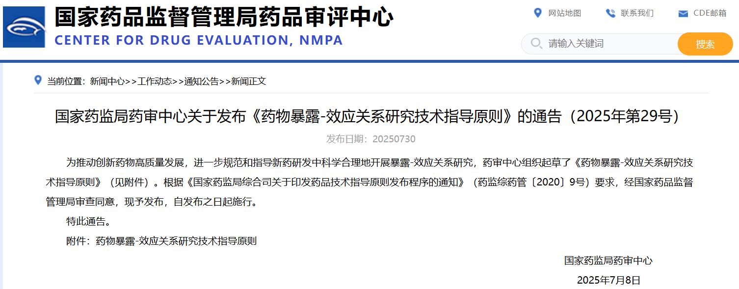 國家藥監(jiān)局藥審中心關(guān)于發(fā)布《藥物暴露-效應(yīng)關(guān)系研究技術(shù)指導(dǎo)原則》的通告(2025年第29號)