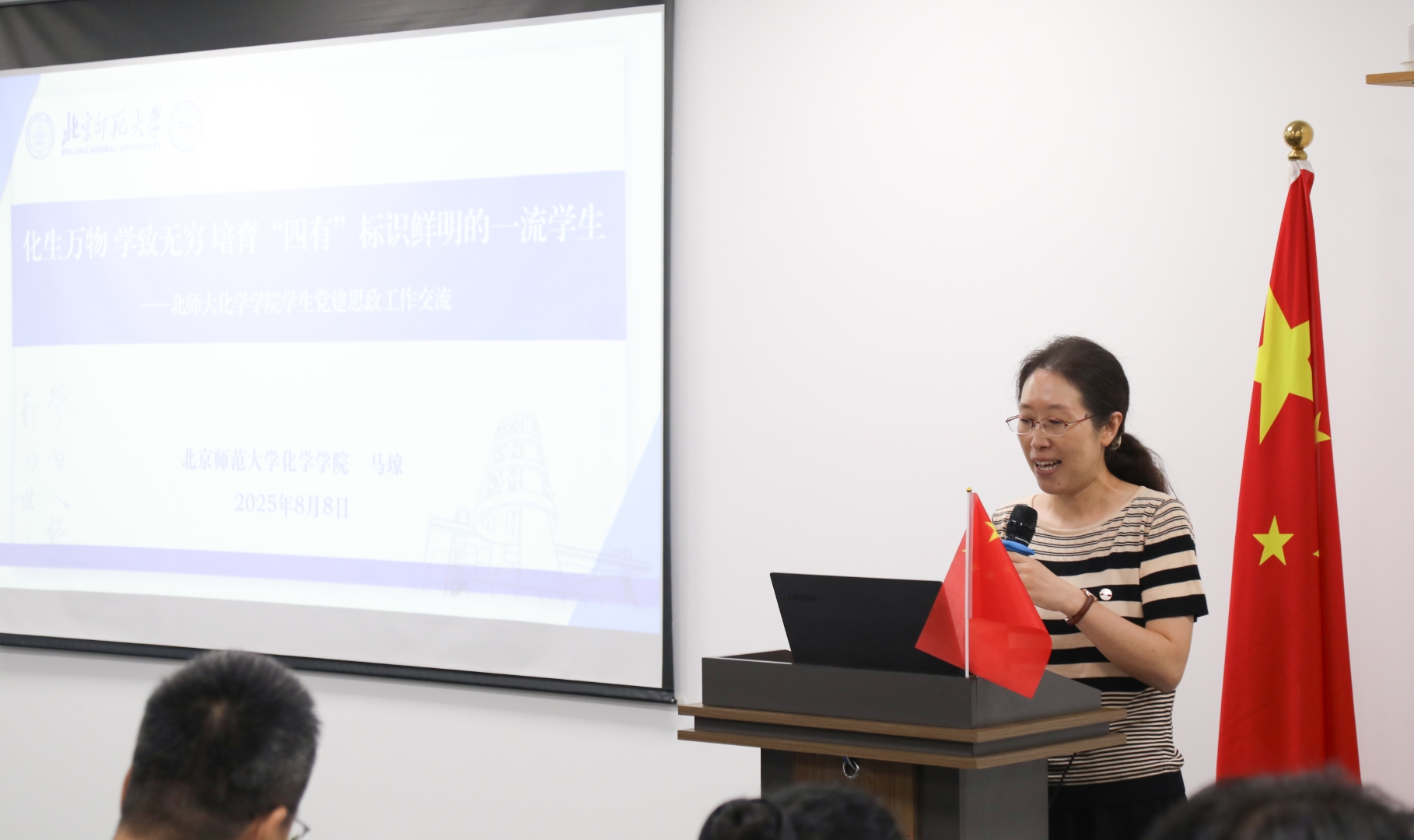 北師大化學學院黨委副書記馬瓊作《化生萬物,學致無窮,培育“四有”標識鮮明的一流學生》報告闡述,分享了學院以黨建為引領,通過構建第一、第二課堂協同育人模式,培養學生明辨力、學習力、溝通力、創新力、成長力“五力”的經驗。