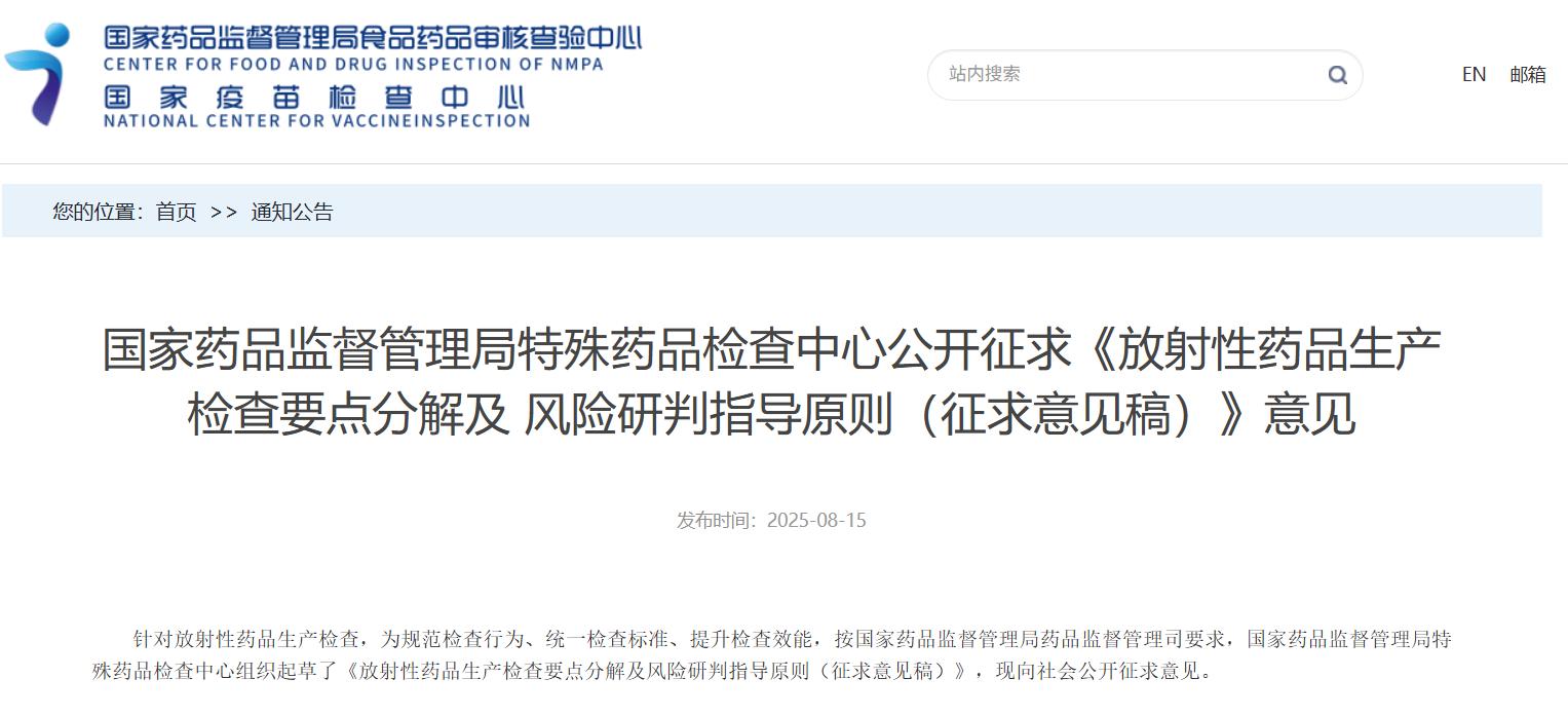 國家藥品監(jiān)督管理局特殊藥品檢查中心公開征求《放射性藥品生產檢查要點分解及 風險研判指導原則(征求意見稿)》意見