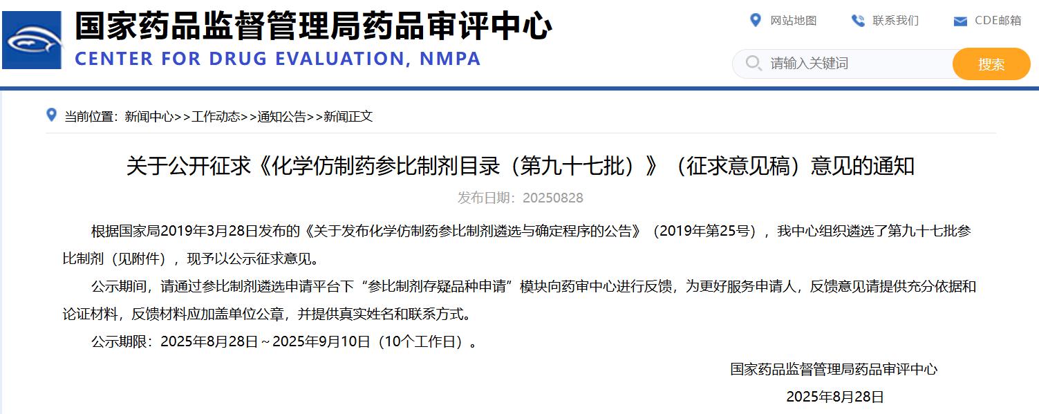 關于公開征求《化學仿制藥參比制劑目錄(第九十七批)》(征求意見稿)意見的通知