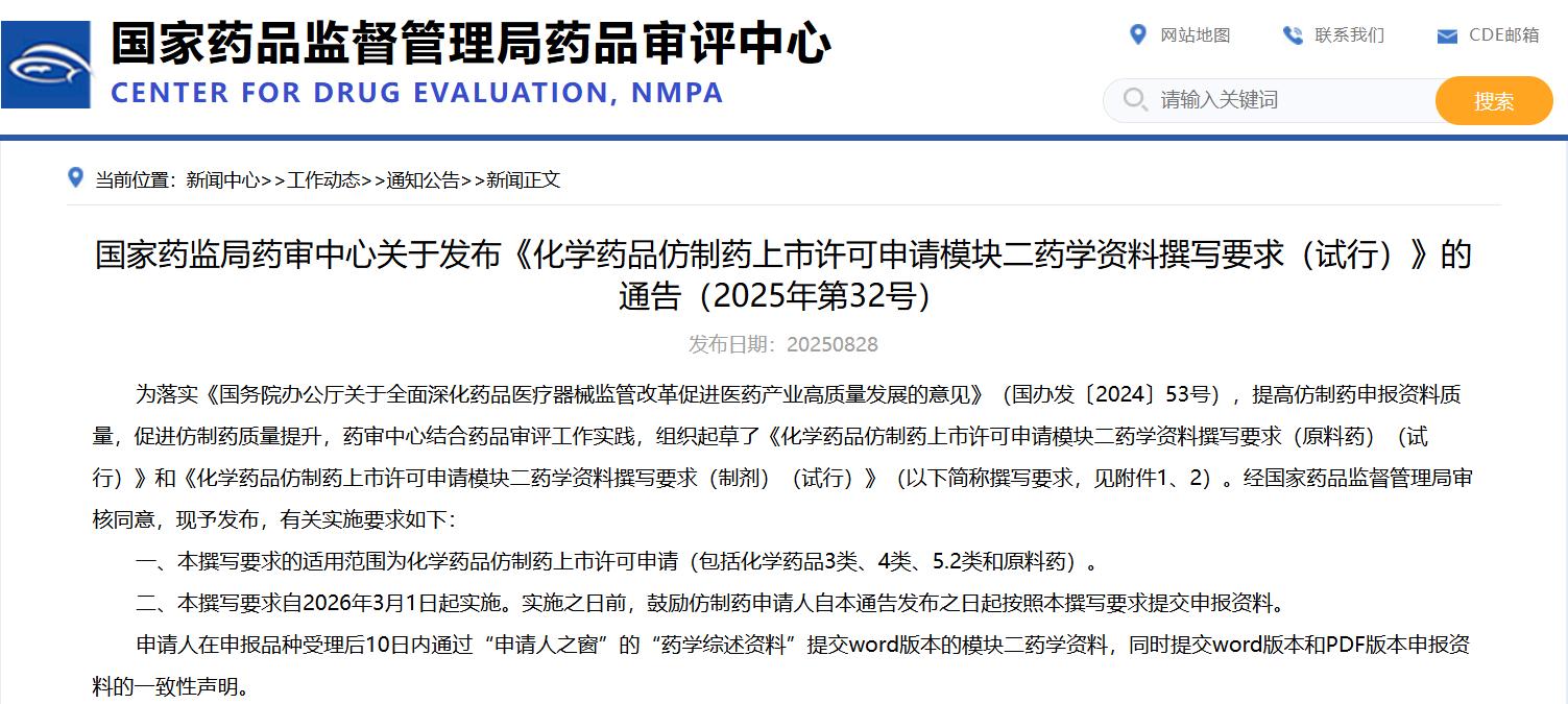 國家藥監局藥審中心關于發布《化學藥品仿制藥上市許可申請模塊二藥學資料撰寫要求(試行)》的通告(2025年第32號)